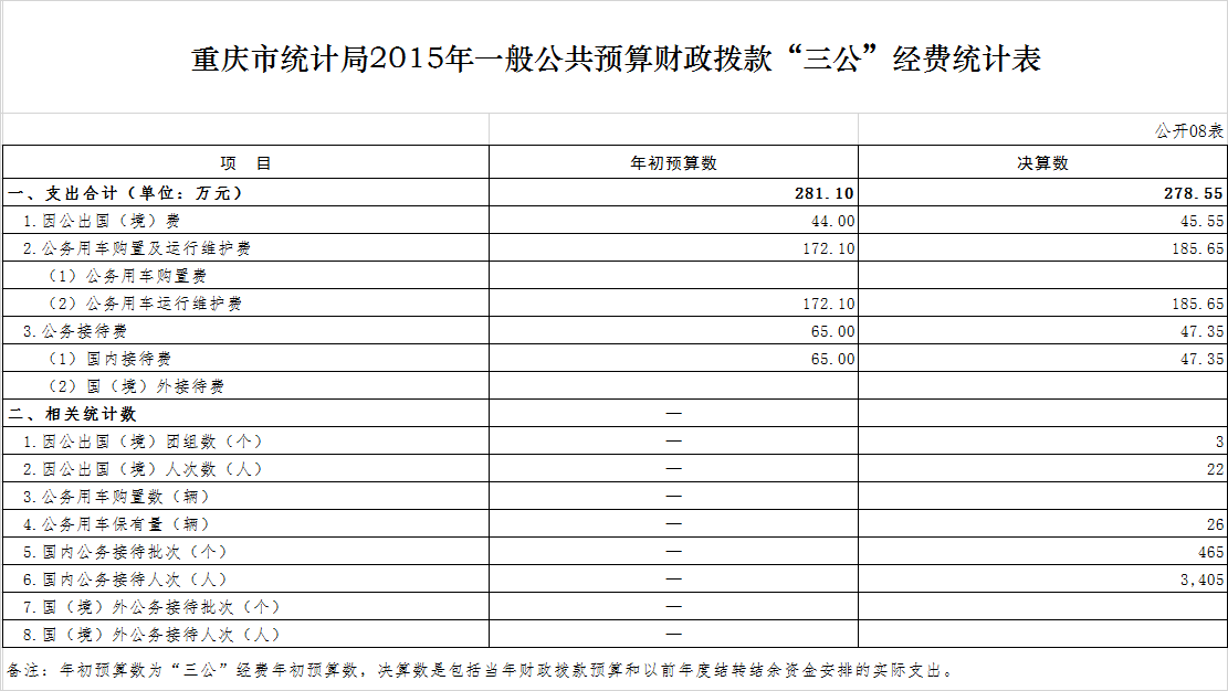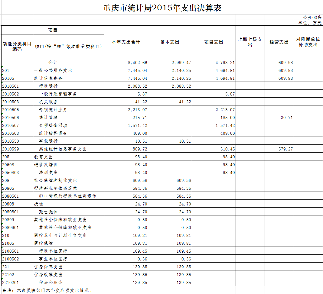 (一)2015年部门决算本年收入8897.31万元,比上年决算数增加370.60万元,比年初预算增加3005.20万元,主要原因是因收入政策波动较大,在编报预算时其他收入预计不足。2015年部门决算本年支出8402.66万元,比上年决算数增加192.88万元,比年初预算数增加2510.55万元,主要原因是增加了重庆市第三次经济普查专项调查及全国1%人口抽样调查专项经费。2015年年末结转和结余为327.03万元,主要为库区经济综合统计信息系统经费。