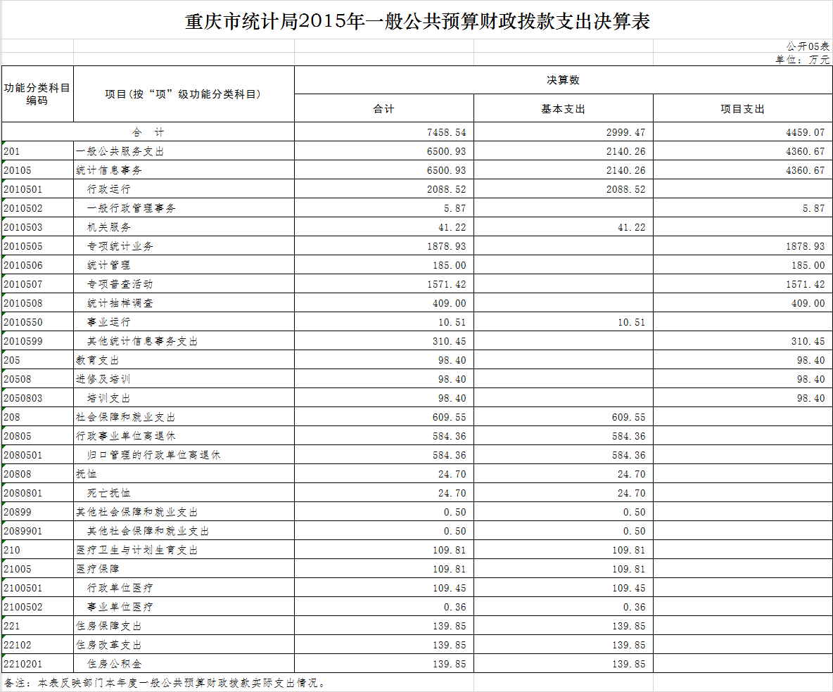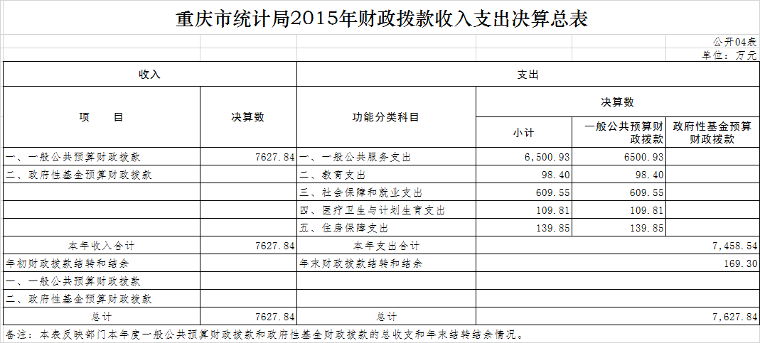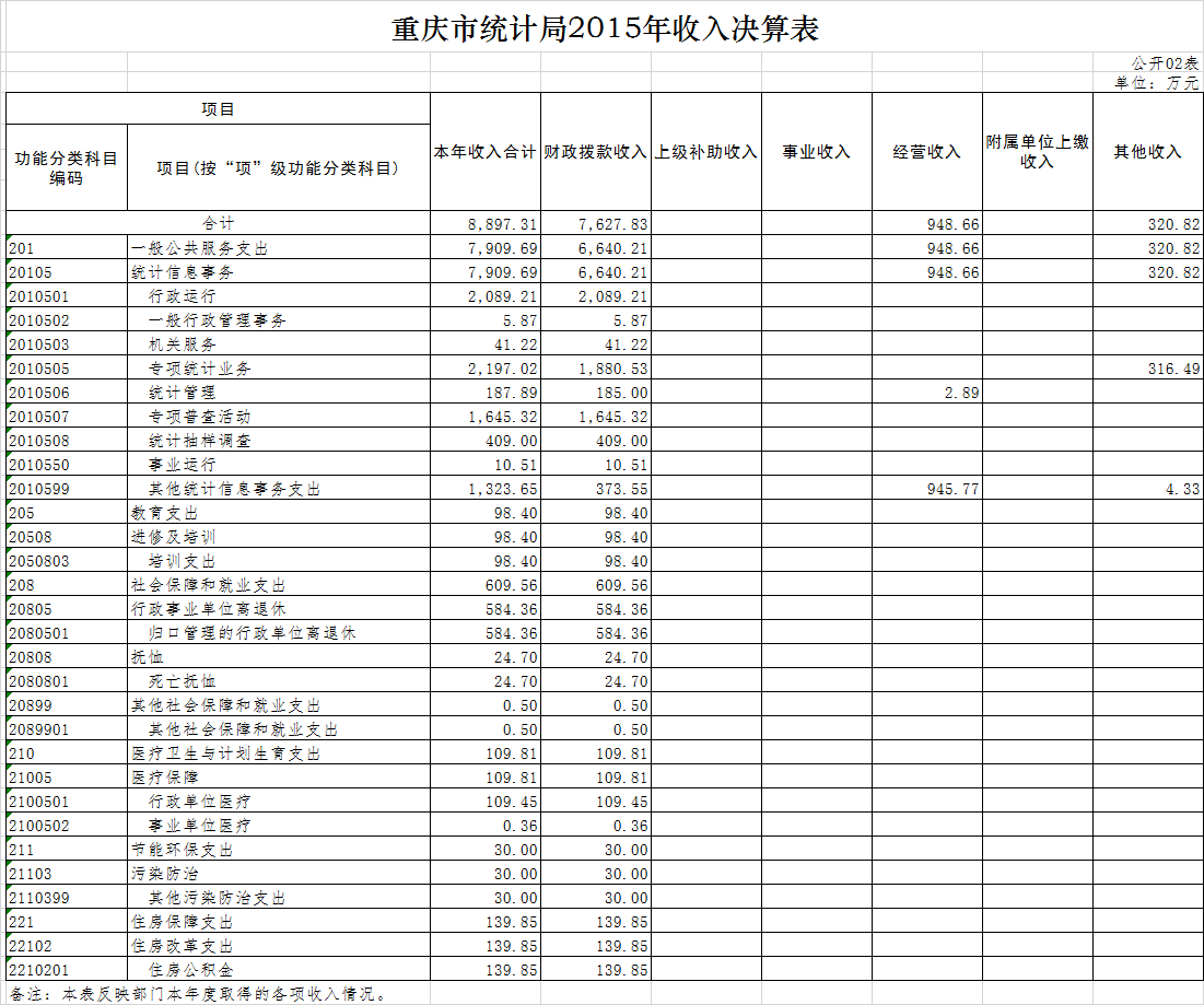 (一)2015年部门决算本年收入8897.31万元,比上年决算数增加370.60万元,比年初预算增加3005.20万元,主要原因是因收入政策波动较大,在编报预算时其他收入预计不足。2015年部门决算本年支出8402.66万元,比上年决算数增加192.88万元,比年初预算数增加2510.55万元,主要原因是增加了重庆市第三次经济普查专项调查及全国1%人口抽样调查专项经费。2015年年末结转和结余为327.03万元,主要为库区经济综合统计信息系统经费。