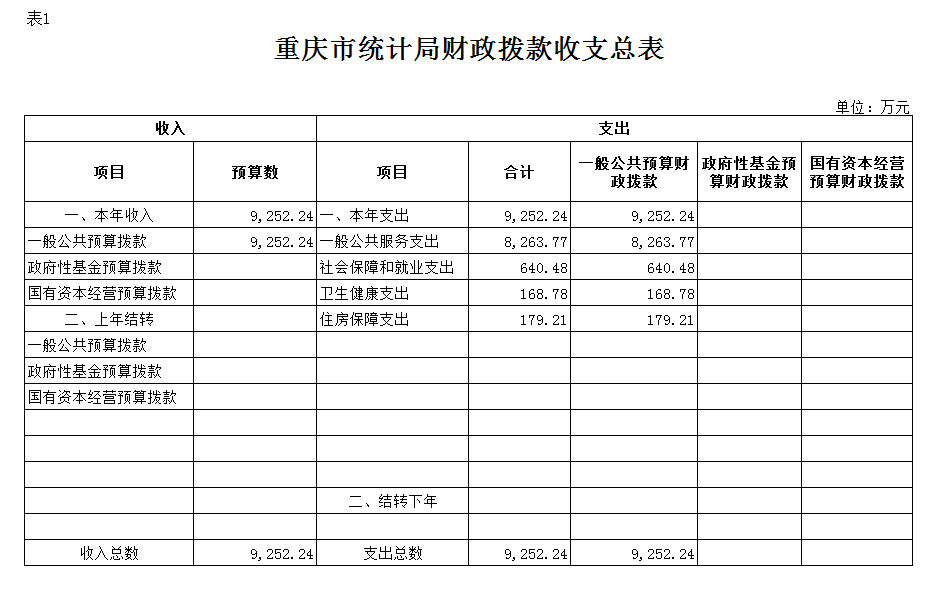 2019年一般公共预算财政拨款收入9252.24万元,一般公共预算财政拨款支出9252.24万元,比2018年增加2877.88万元。其中:基本支出4115.98万元,比2018年增加115.3万元,主要原因是基本支出按政策增支等,主要用于保障在职人员工资福利及社会保险缴费,离退休人员离退休费及生活补助,保障部门正常运转的各项商品服务支出;项目支出5136.26万元,比2018年增加2762.58万元,主要原因是增加了全国第四次经济普查经费及统计信息化运维经费;项目支出主要用于全国第四次经济普查、投入产出调查、企业一套表、专项统计业务、信息化运维等重点工作。